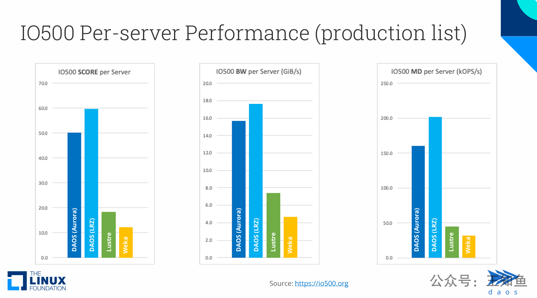 2021: 在IO500排行榜前22名中,有11个系统使用了DAOS。同年,启动了Coral NRE项目。
