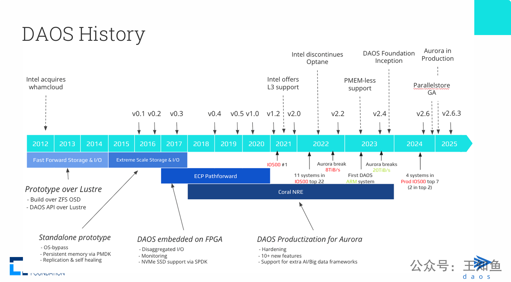 2023: DAOS增加了对无PMEM(持久性内存)环境的支持 (PMEM-less support)。DAOS基金会 (DAOS Foundation) 成立。发布v2.4版本。