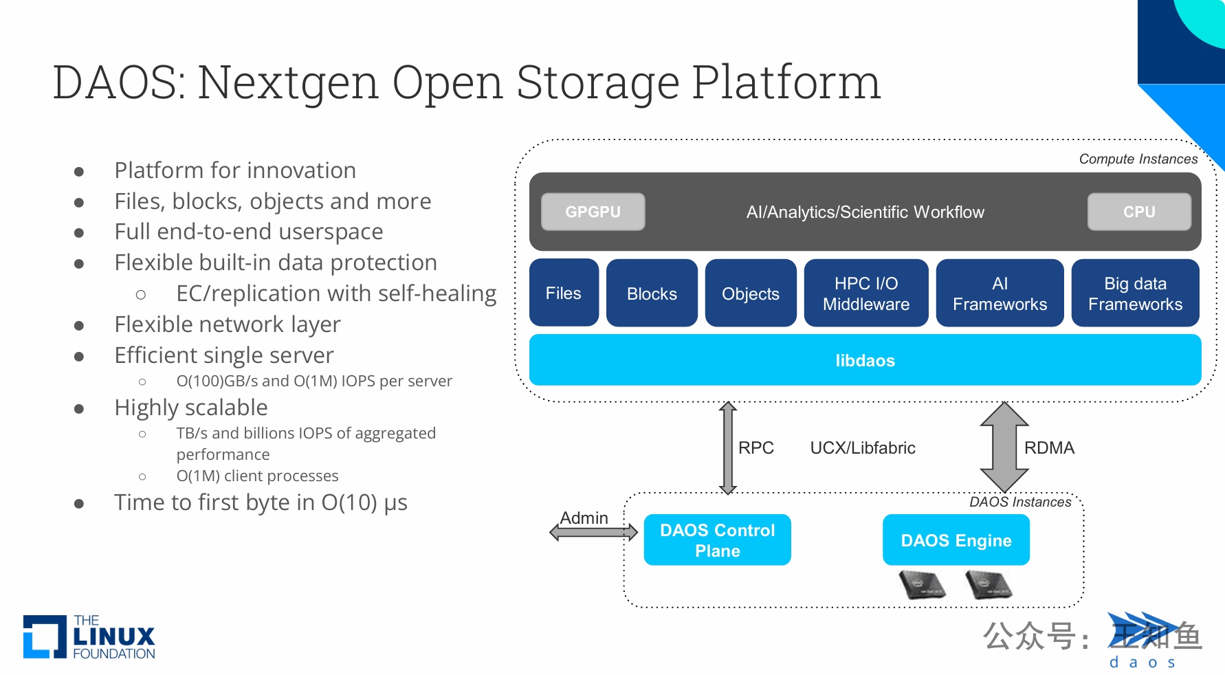 Files, blocks, objects and more (支持文件、块、对象等): 表明DAOS是一个统一存储平台,能够通过不同的接口提供文件、块和对象存储服务。