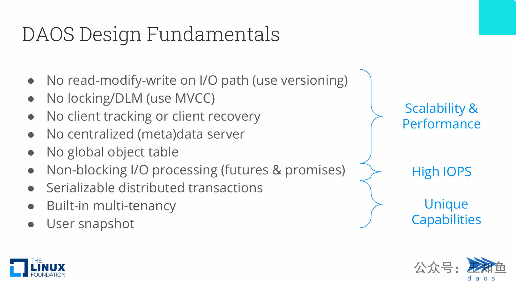 这类原则为DAOS带来了超越传统存储系统的高级功能。