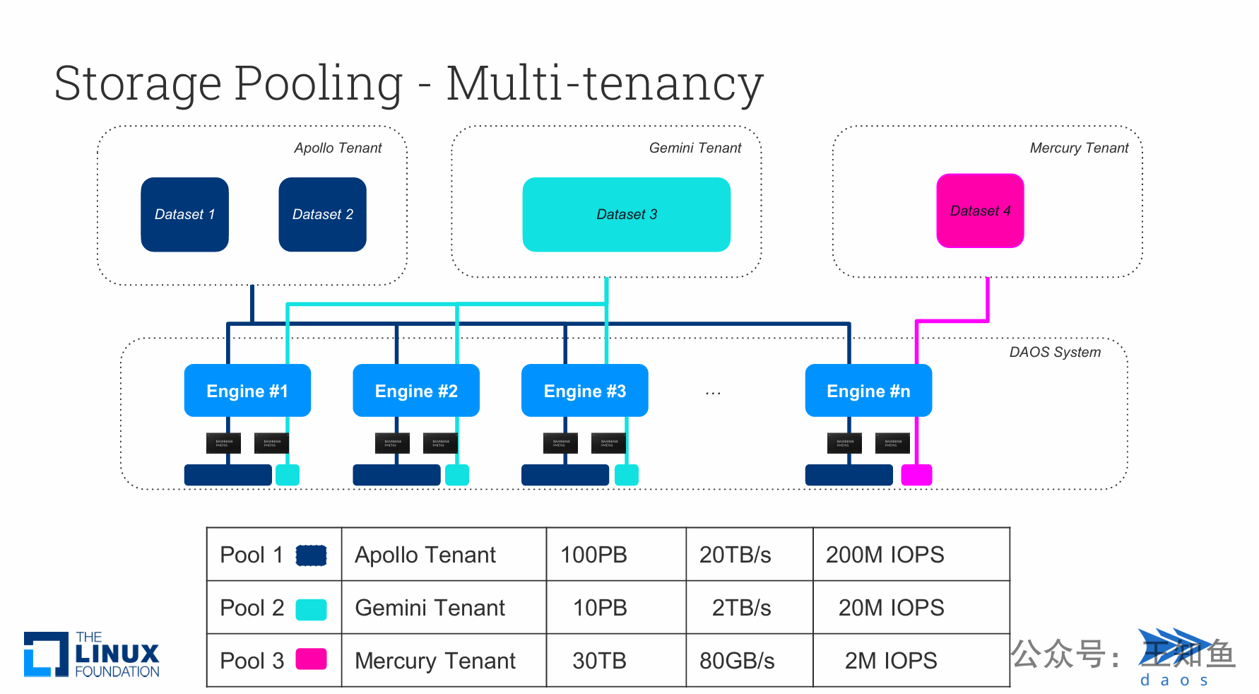 服务多样化与灵活性: 通过存储池化,一套DAOS集群可以同时满足不同规模和性能需求的应用场景。如图中所示,它可以同时为一个需要100PB容量和20TB/s吞吐的旗舰级应用(Apollo),以及一个仅需30TB容量的小型应用(Mercury)提供服务,展现了极高的管理灵活性。
