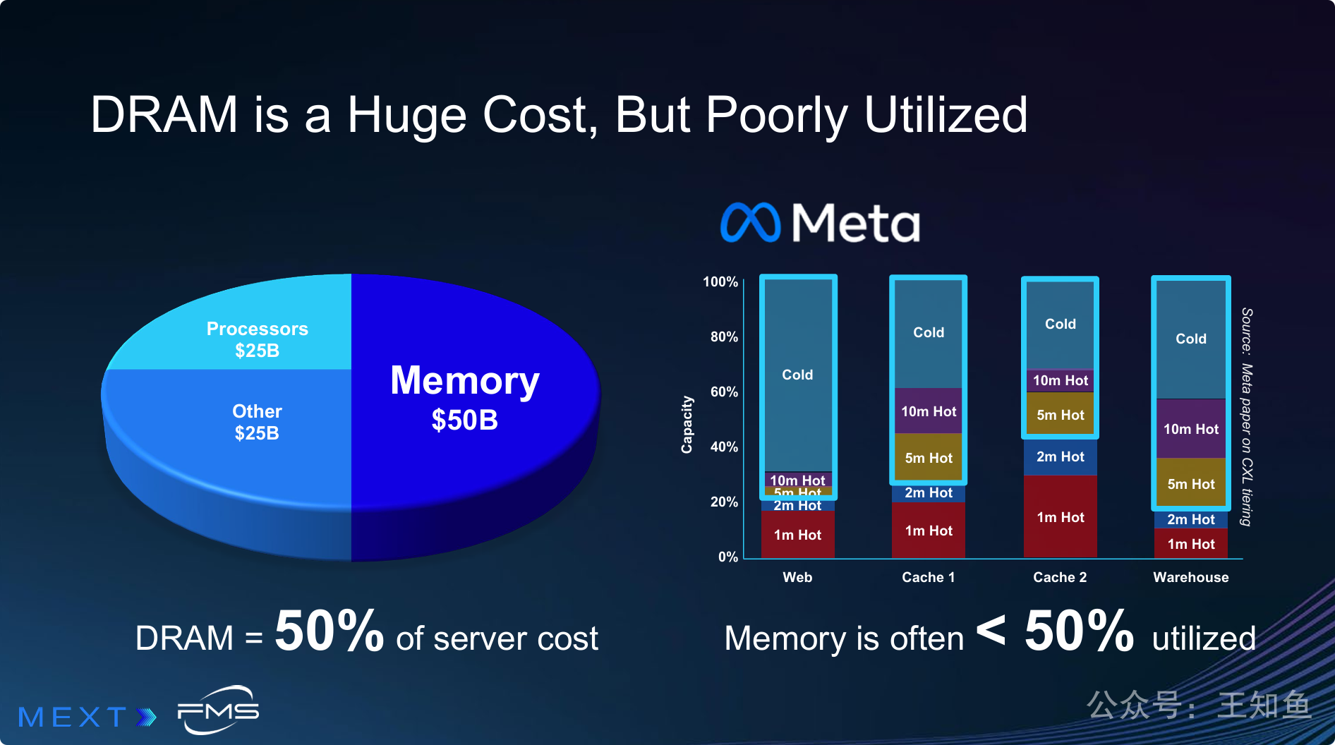 效率低下:尽管价格不菲,但根据Meta等超大规模数据中心的真实数据显示,这部分昂贵的内存资源并未得到充分利用,常常有超过一半的容量被“冷数据”占用,导致有效利用率不足50%。要理解这里的有效利用率,从工作经验来看DRAM利用率是很容易虚高的,但通常都是被冷数据占用。