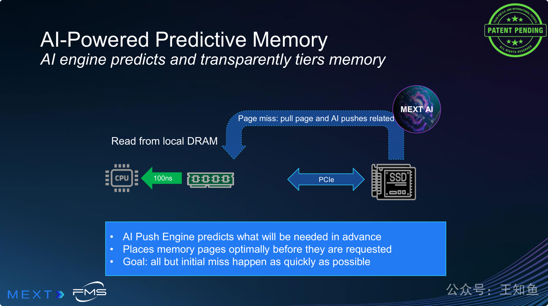 它通过将昂贵但快速的DRAM作为缓存层,将廉价且大容量的SSD作为扩展层。其技术关键在于MEXT AI引擎:当发生DRAM缓存未命中时,AI不仅会处理当前的读取请求,更重要的是会主动预测并预取接下来可能被访问的相关数据到DRAM中。
