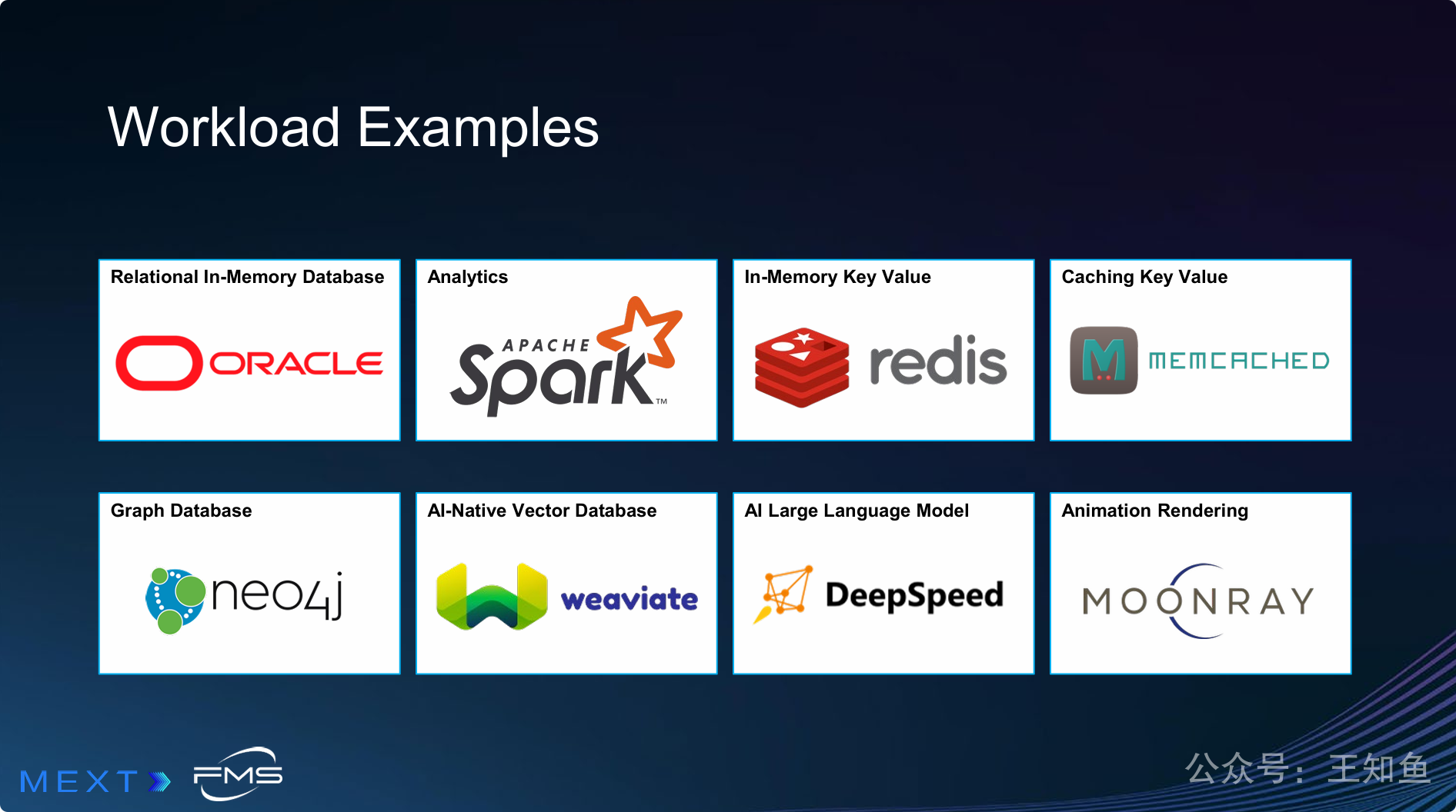 应用示例:列举了一些具体的应用案例,包括:Redis、Neo4j、Spark、Moonray、Oracle、Memcached、DeepSpeed。这些是业界常见的内存密集型或计算密集型应用,涵盖了内存数据库、图数据库、大数据处理框架、渲染引擎、关系型数据库和AI训练框架等。