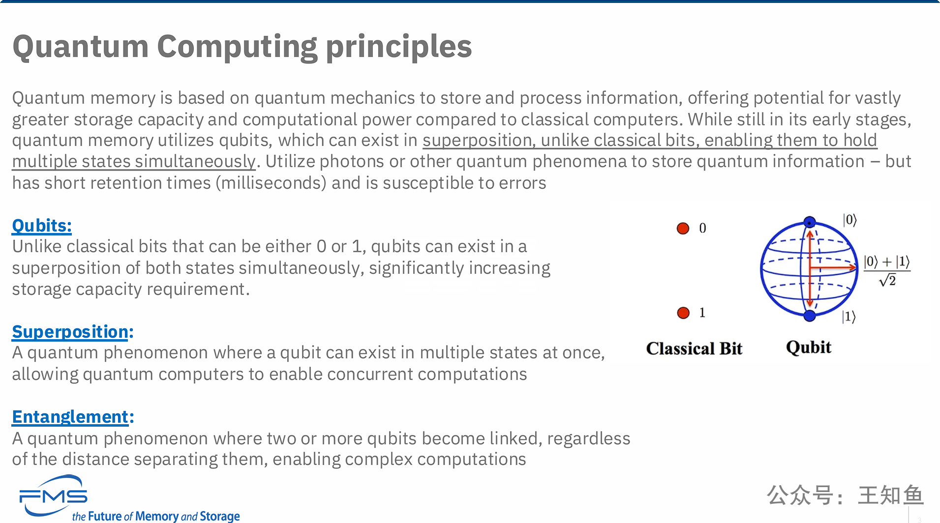 科普核心概念: 为不熟悉量子领域的观众(特别是存储行业的专业人士)清晰地定义了量子计算的三大基石:量子比特 (Qubit)、叠加态 (Superposition) 和 纠缠态 (Entanglement)。它通过与传统比特的对比和布洛赫球面的图示,让这些抽象概念更易于理解。
