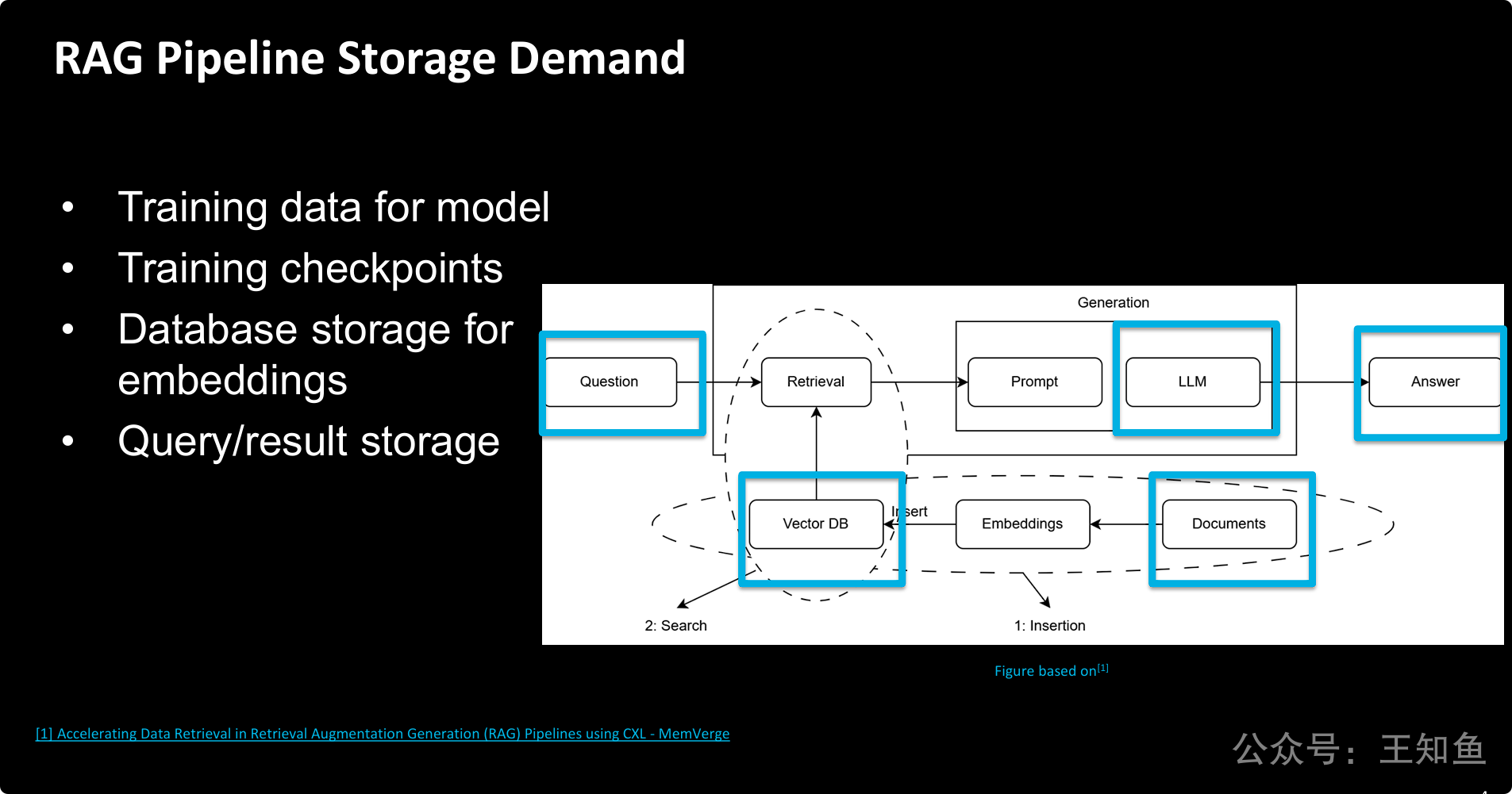 模型生命周期存储: 包括训练LLM所需的海量原始数据和在训练过程中产生的大量模型检查点。这部分是RAG系统的基础,通常是存储需求的“大头”。