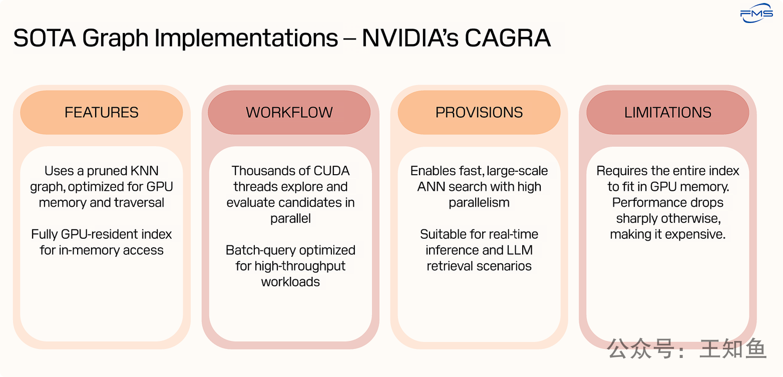 - 清晰辨析当前高性能ANN方案(如NVIDIA CAGRA)与大规模低成本方案(如微软DiskANN)各自的优势与局限性,以及它们在性能、成本和容量上的权衡。