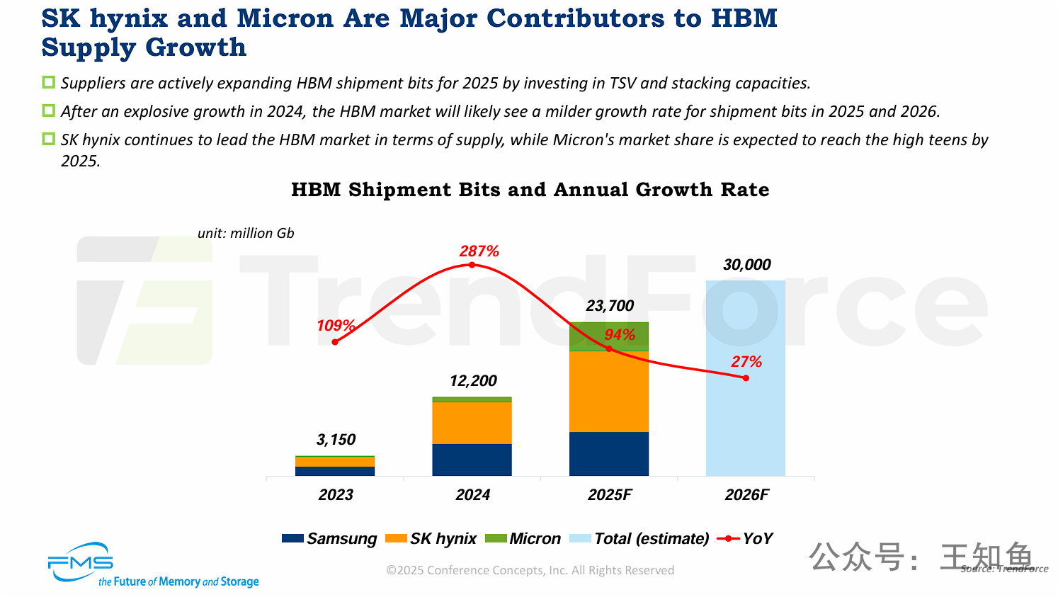 市场高速增长后放缓: HBM市场出货量在2024年迎来了287%的爆发式增长,但预计在2025年(94%)和2026年(27%)增长率将明显减速。