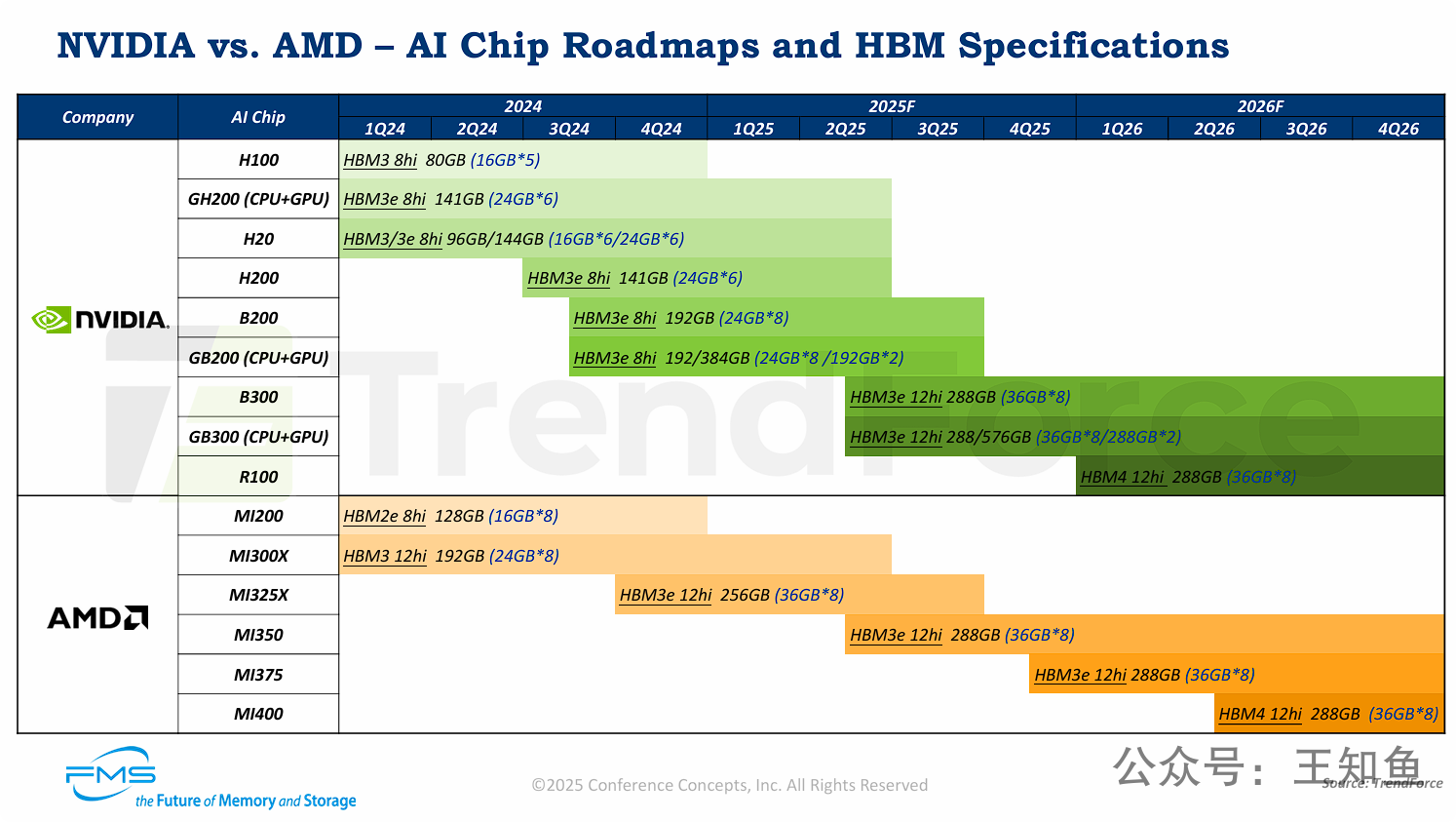 详细对比了NVIDIA和AMD两家公司的AI芯片产品路线图,时间跨度从2024年第一季度 (1Q24) 到2026年第四季度 (4Q26),重点是各芯片所搭载的HBM(高带宽内存)的规格。