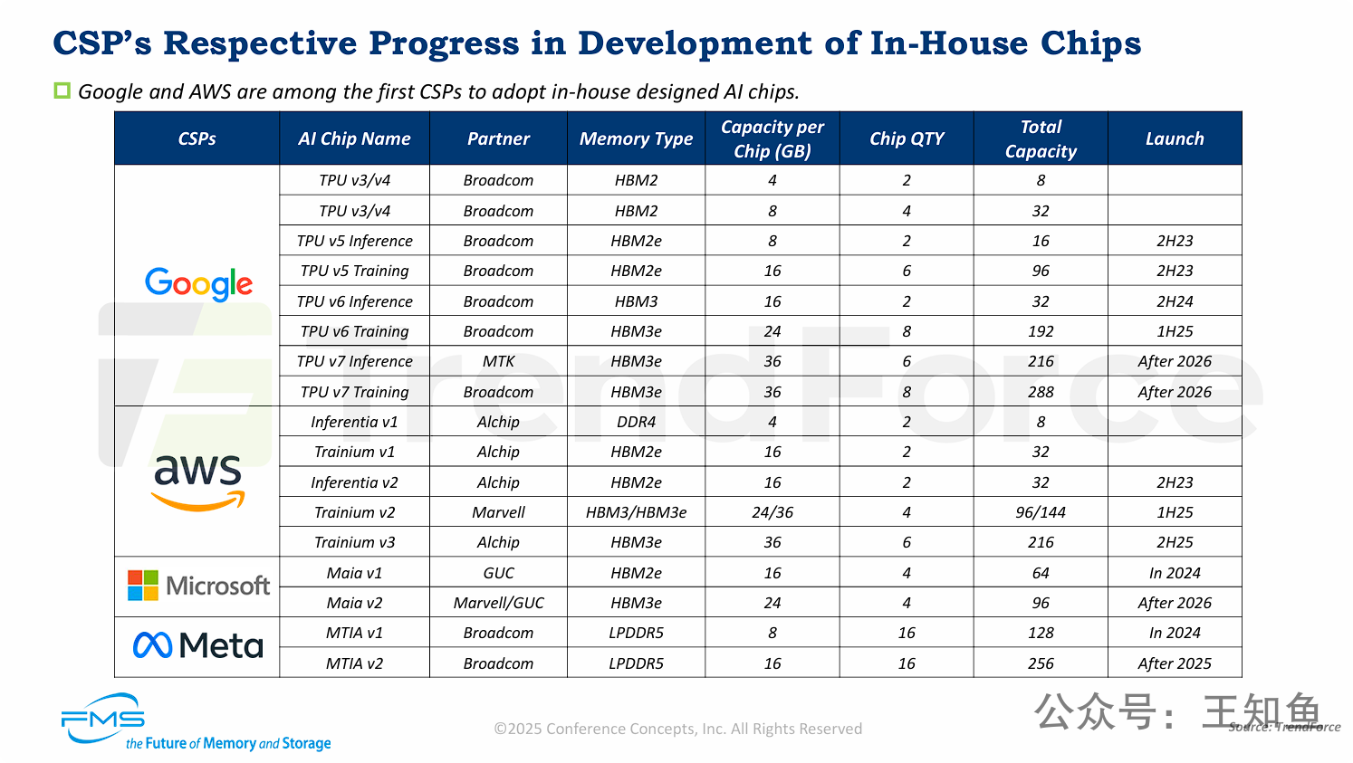 差异化内存策略: 并非所有CSP都选择HBM。Meta的MTIA芯片采用了LPDDR5内存,这是一种与HBM不同的技术路径,可能更侧重于成本、功耗或特定推理场景(如推荐系统)的优化。