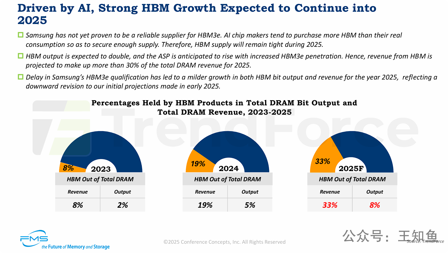 价值与产量的巨大差异: HBM是一种高价值产品。预计到2025年,HBM的比特产出(产量)仅占DRAM总市场的8%,但其贡献的收入(价值)却将高达DRAM总收入的33%(即三分之一)。