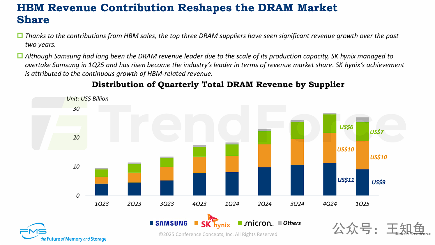 SK海力士登顶: 凭借在HBM市场(特别是HBM3和HBM3e)的领导地位和相关收入的爆炸式增长,SK海力士的DRAM总收入在2025年Q1(预测)成功超越三星,成为全球第一大DRAM供应商(按收入计算)。