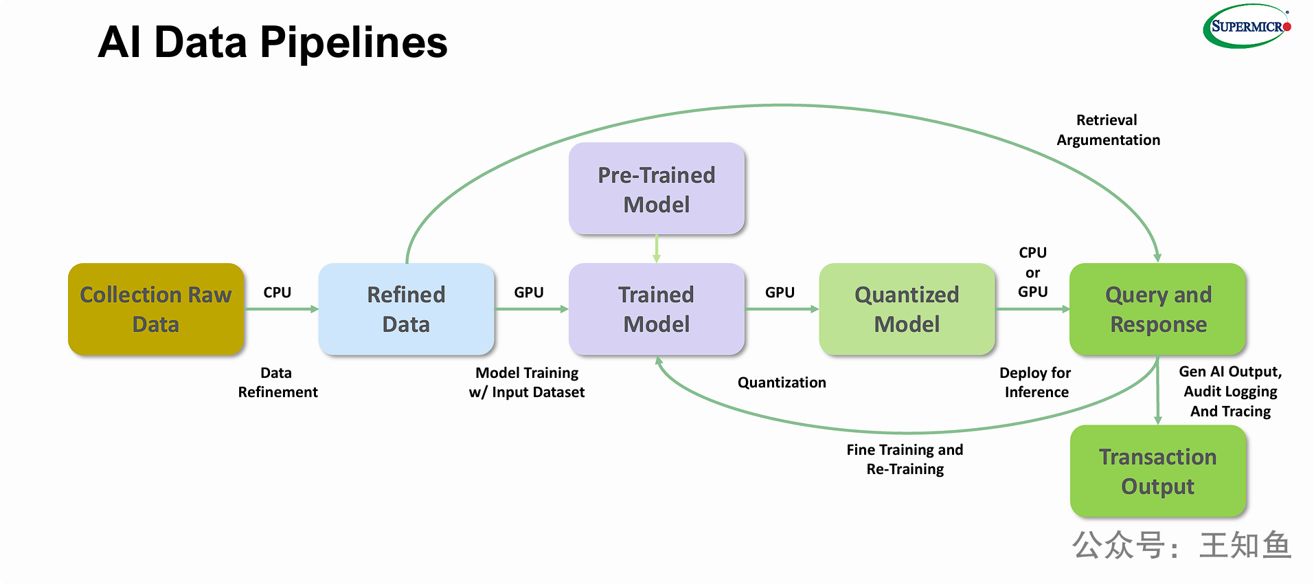 (隐含的存储意义): 作为一个 AI 数据管道,这张图隐含了对多层存储架构的需求:需要大容量存储来“收集原始数据”;需要高性能、高吞吐的存储(如并行文件系统或高速闪存)来支撑 "Refined Data" 被 GPU 集群高速读取以进行“模型训练”;还需要快速的存储来加载 "Quantized Model" 并处理 "Query and Response" 阶段的日志和追踪数据。